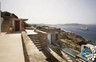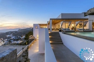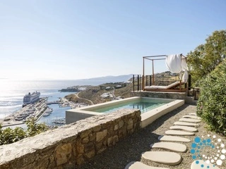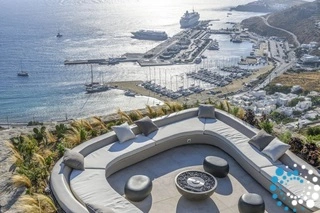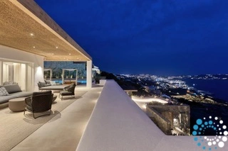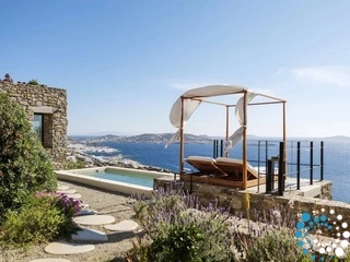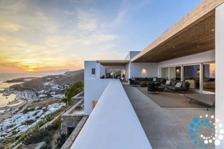 The villa, primely located, offers a stunning panoramic view of Mykonos Town, the port and the islands of Delos, Rhenia, Tinos, Syros, and Paros. This unforgettable tableau captivates and enchants, providing uninterrupted vistas of the Aegean Sea.