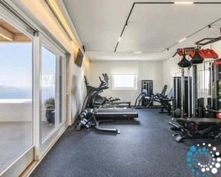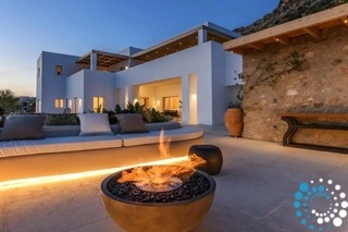 The crowning glory of the property is its awe-inspiring infinity pool, casting an unbroken mirror over the cerulean Aegean Sea. It's complemented by an outdoor fireplace for memorable, star-lit gatherings, a state-of-the-art indoor gym, and an outdoor guardroom, providing an additional layer of security.