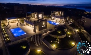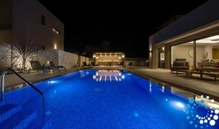 Ascending a beautiful wooden staircase you are found on the first floor which features a master, king sized bedroom with an en-suite bathroom. A sliding glass door leads to a very large glass framed, furnished terrace which overlooks the blue sea, Thodorou Island and the White Mountains. Taking down the stairs, one is found in the lower floor which is another great addition to the villas with two extra guest bedrooms (twin & queen) and two extra bathrooms with large, glass shower cabins and granite countertop basins. On this level you will also find the complementary rooms such as the fitness room, the secondary living room, the spa room (sauna & Jacuzzi) and the laundry facilities.